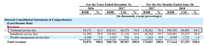 从主营业务收入来看,公司收入来源主要分为三大类:技术服务费、分期服务费以及财富管理服务费。其中技术服务费一直为公司报告期内核心收入来源,截至今年上半年,该项收入占比达到69.2%。