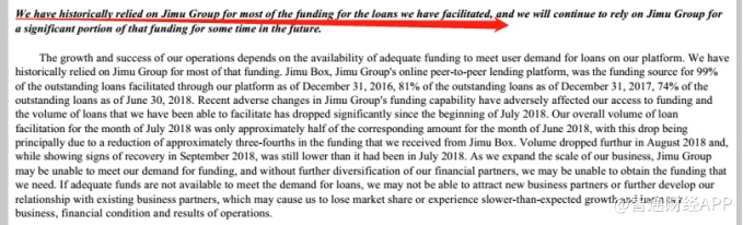 在招股书的风险因素中,品钛还对自身融资渠道单一做了披露,至于单一到什么程度呢?上面的描述中做了一定解释:“截至2016年12月31日,品钛贷款中99%的资金都是从积木集团获取,截至2017年12月31日,这一比例下降至82%,到今年上半年,这一数据为74%”。