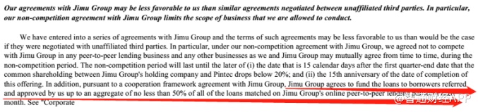在招股书披露的品钛与积木集团的协议中,提到了一项双方签署的“竞业禁止协议”,协议规定,品钛将不再与积木集团在任何P2P借贷业务进行竞争,并且还需向积木集团提供一定的技术支持和服务,反过来,积木集团将在每月向品钛批准的借款人提供不少于公司P2P网络借贷平台募集的50%的资金。