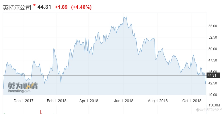 目前,英特尔的股价较52周高位57.6美元下跌了25%左右,周四收于44.31美元。今年以来,英特尔公司的股价累跌4.46%,低于同期纳指累计9.09%的涨幅。