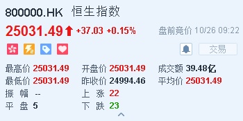 智通财经APP获悉,周四(10月25日)美股大涨,道指涨约400点,科技股领涨大盘。A股政策利好,昨日现收涨。恒生指数开盘涨0.15%,报25031.49点。国企指数涨0.02%,报10178.34点。红筹指数涨0.74%,报4106.55点。大市盘前成交亿39.48港元。