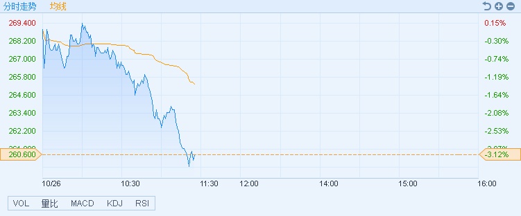 智通财经APP获悉,受美国科网股龙头亚马逊及Google母企Alphabet盘后急泻拖累,腾讯(00700)盘中跌破260港元关口至259.4港元,创17个月新低,拖累恒指73点。截至11时24分,跌3.12%,报价260.6港元,成交额30.78亿。