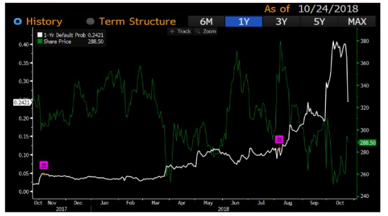 比如,戴姆勒最新发布的盈利预警,部分原因是在美国的豪华车市场份额急剧下降,而被特斯拉抢了市场。从特斯拉公布的强劲财报来看,该公司的违约概率显著降低(见下图);特斯拉债券在未来几个季度可能会获得大量买盘。