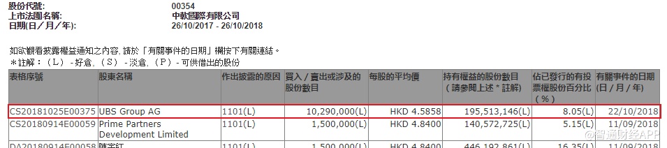 智通财经APP获悉,根据联交所资料显示,UBS Group AG于10月22日增持中国软件国际(00354)1029万股,每股作价4.59元,总值4719万元,最新持股量增至8.05%。