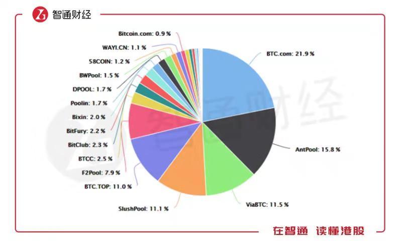 由于挖矿难度指数级增加,就出现了矿池,所谓的矿池是矿工或矿场算力加入组成的,因为挖到的概率与矿工投入的设备算力大小成正比,单个矿工算力已经很难获得区块奖励,因此有了合作挖矿的运作方式。目前来看,全球前六大矿池算力占了79.2%的份额,其中比特大陆旗下的BTC.com、Antpool以及持股的ViaBTC合计占了近50%的份额。