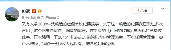 微博中写道:“又有人拿2008年就编造的虚假会议纪要搞事,关于这个编造的纪要我已发过多次声明,这个纪要是假冒、编造的谎言。在新版的《时间的玫瑰》里面也特意提过此事。再次强调一下2015年以前东方港湾以专户管理为主,不收任何管理费,客户不赚钱,我们一分钱收入也没有。请各位明辨是非。”