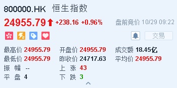 智通财经APP获悉,恒生指数开盘涨0.96%,报24955.79点。国企指数涨1.01%,报10159.89点。红筹指数涨0.69%,报4083.05点。大市盘前成交18.45亿港元。