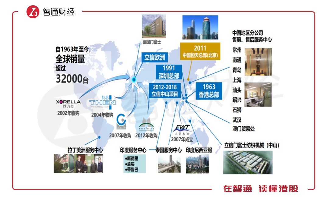 过去我们在科研方面有极大的投入,我们在香港及深圳的布吉包括德国都设有科技研发中心,我们的研发队伍技术强学历高。下面这张图大家可以直观地看到我们在国内乃至全球的各方面业务,以及支持部门的分布,这是对我们的整个产品布局和品牌的一个直观的描述。可以毫不谦虚的说,在印染跟染整的机械制造这一细分板块,我们处于行业的龙头地位,从产品的高端定位、市场的垄断程度以及毛利率,我们都是遥遥领先。
