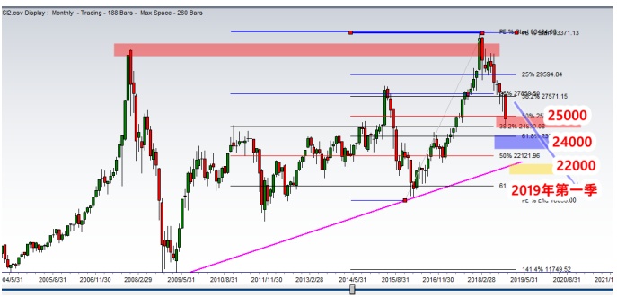 恒生指数目前月线图中出现双顶型态,股市目前的确25000点的支持,25日已跌穿。读者必须留意这关口是黄金比率的50%,是江恩理论中重要的支持位置,笔者认为久守必失,如三天之内未能重上25000点,最终恒指亦大概率下试24000点/22200点的水平。我使用的方法是时间为主,价格为次。所以恒指的第一个底部或会发生在2019年第一季时间。