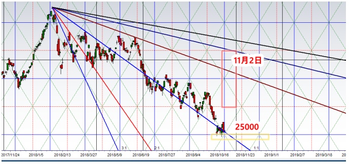 我们在10月前在专栏中,笔者曾指出恒生指数未到底,及10月回调的可能性。目前一一兑现。恒生指数再一次回调到25000点关口,并且在10月25日已跌穿,命在旦夕。所以我们用江恩理论及K线分析一下股市之后的走势。