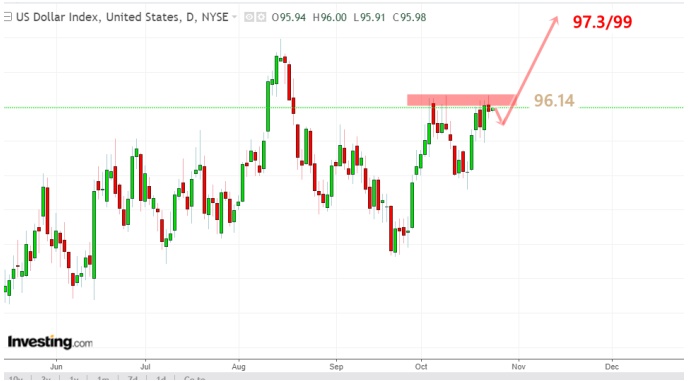同时港股近日的走势亦被美元影响,原因是香港大部分上市公司都是有美元外债,但收入是港币或人民币,如果美元上升,会加重部份公司的偿还压力。目前美元走势在升穿了96.14的阻力,或会上试97.3./99的水平。