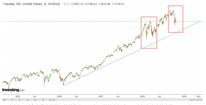 同时读者可以留意代表科技股的纳指自2016年开始就牛气冲天,今年发生比较大的回调,上图圈着就是过去两次的回调,这次的幅度亦比美过去两次。而亚马逊收入逊预期,股价盘后曾大跌逾9%,或者美股的牛气已经退减,走到尽头。所以美股投资者必须留意,目前在江恩理论时间周期当中,现在直到11月中,美股仍是下跌敏感周期。
