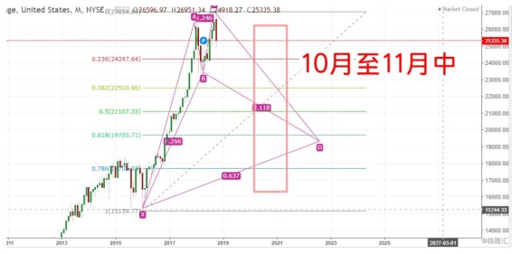 这张图表我们在上周也发过一次,美股牛转熊已变为大概率事件。上图为月线图,已形成双顶走势,目前道指只是回调如果用黄金比率,第一个目标在24247/22510。但上图是一款名的“和谐交易”的形态交易,一旦道指跌穿22510,那道指就成了这个下跌形态,剑指19703。