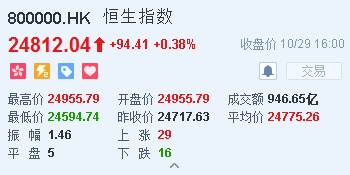 智通财经APP获悉,恒指早盘高开238点,盘中最低跌至24594.74点。截至收盘,恒生指数涨94.41点或0.38%,报24812.04点,全日成交额达946.65亿。国企指数跌0.46%,报10012.63点,红筹指数跌0.22%,报4046.29点。