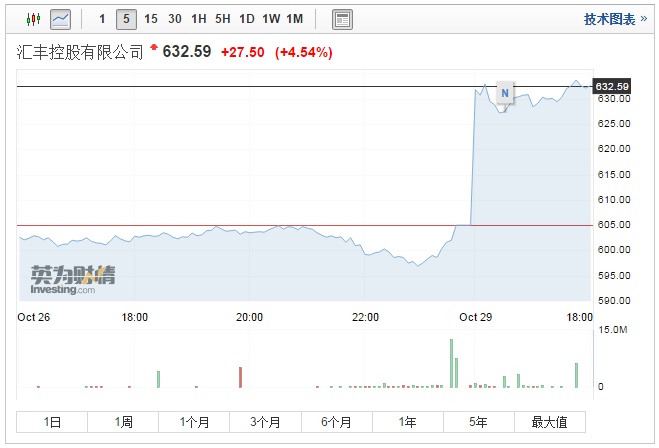 智通财经APP获悉,受三季度业绩利好刺激,汇控(HSBA.UK)伦敦开盘大涨,截至发稿,汇控伦敦涨4.54%,报632.59英镑。