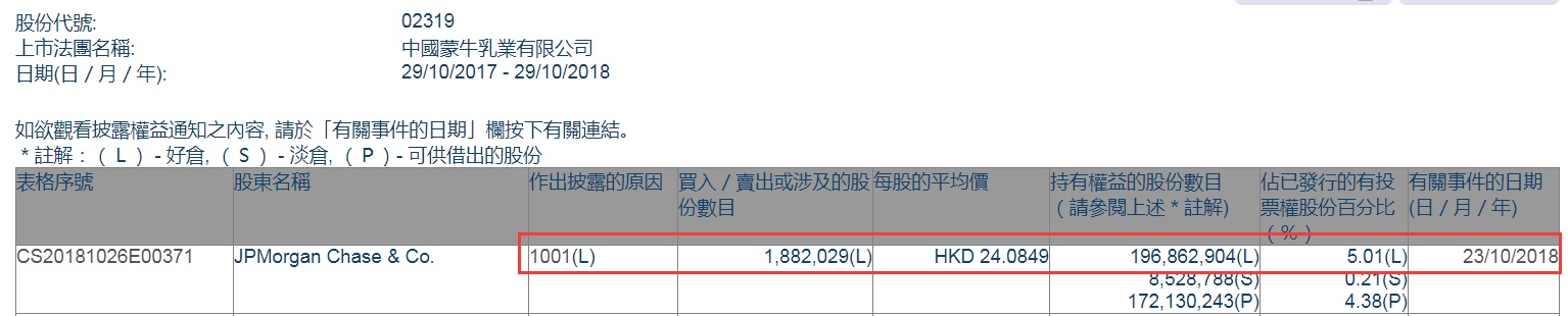 智通财经APP获悉,根据联交所资料显示,蒙牛乳业(02319)于10月23日获摩根大通增持188万股,每股作价24.08港元,总值约4527万港元,最新持股量增至5.01%。