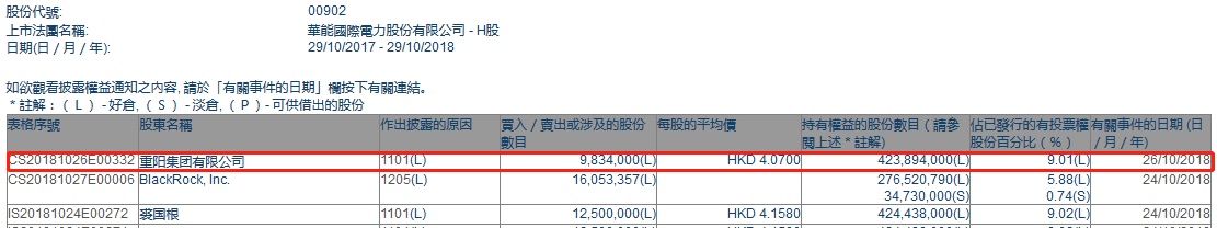 智通财经APP获悉,根据联交所资料显示,重阳集团于10月26日增持华能国际电力(00902)983万股,每股作价4.07元,总值4000万元,最新持股量增至9.01%。