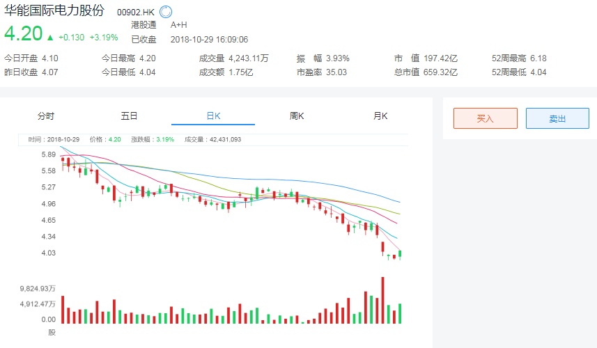 截至今日收盘,华能国际电力(00902)报4.20元,涨3.19%。