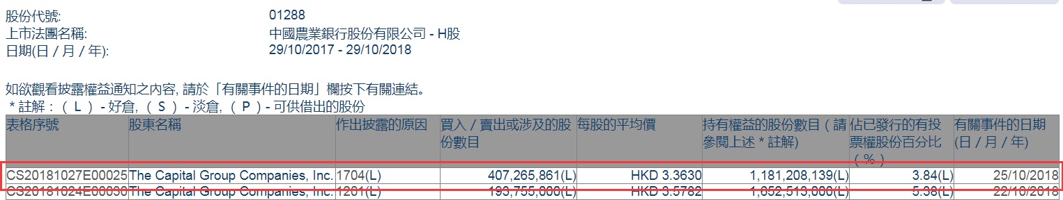 智通财经APP获悉,根据香港联交所资料显示,The Capital Group于10月25日减持农业银行(01288)4.07亿股,每股作价3.36港元,总值约 13.68亿港元,最新持股量降至3.84%。