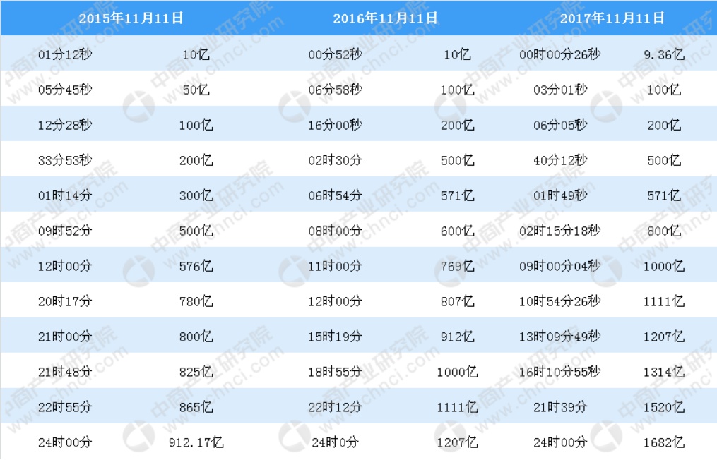 另外,值得注意的是,天猫2013年用时13个小时破了2012年全天的191亿纪录,2014年用时12小时59分钟破了2013年的350亿纪录,2015年用时11个小时49分钟破了2014年的全天571亿纪录,2016年用时15个小时19分钟破了2015年的全天917亿纪录,2017年用时13个小时9分钟破了2016年的全天1207亿纪录。2018年天猫将用多少时间打破2017年的1682亿的记录呢?我们拭目以待!