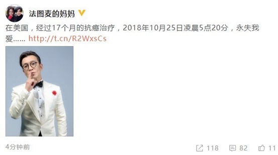 10月29日,李咏妻子哈文发文宣布著名主持人李咏于10月25日凌晨5点20分因癌症去世。哈文发出一张李咏的个人照片,并配文:永失我爱。