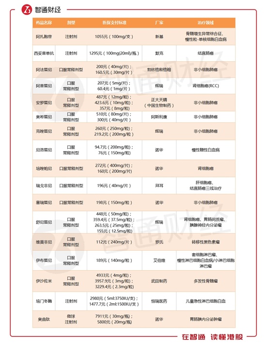 上述17种药品包括12个实体肿瘤药和5个血液肿瘤药,均为临床必需、疗效确切、参保人员需求迫切的肿瘤治疗药品,涉及非小细胞肺癌、肾癌、结直肠癌、黑色素瘤、淋巴瘤等多个癌种。