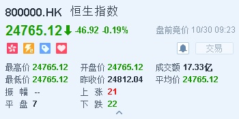 智通财经APP获悉,恒生指数开盘跌46.92点或0.19%,报24765.12点。国企指数涨0.09%,报10021.57点。红筹指数涨0.25%,报4056.36点。大市盘前成交17.33亿港元。