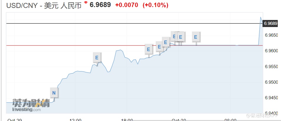 智通财经APP获悉,10月30日,在岸人民币兑美元一度跌至6.9670,创逾10年来最低。截至发稿,在岸人民币兑美元报6.9689,跌70个基点或0.10%。