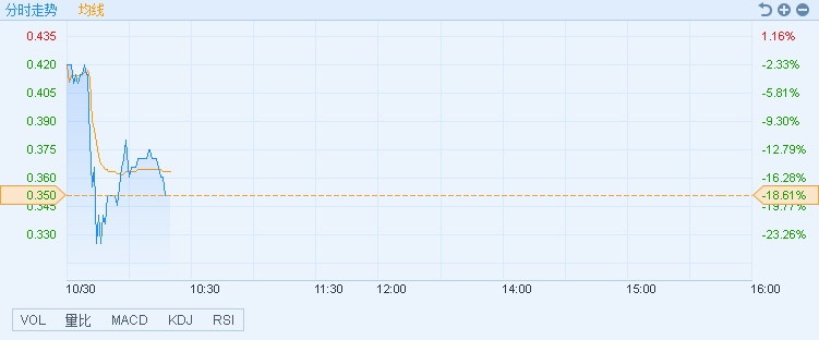 智通财经APP获悉,中滔环保(01363)称并未涉嫌伪造国家机关印章,今日复盘,股价续挫,截至10时18分,跌18.6%,报价0.35港元,成交额1423.98万。