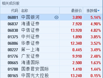智通财经APP获悉,A股券商股全线上涨,多只股涨幅超9%。港股券商股随A股强势上涨,截至13时21分,中国银河(06881)涨5.14%,报价3.89港元,海通证券(06837)涨4.9%,报7.92港元,中信证券(06030)涨4.82%,报13.92港元,华泰证券(06886)、第一上海(00227)均涨超3%。