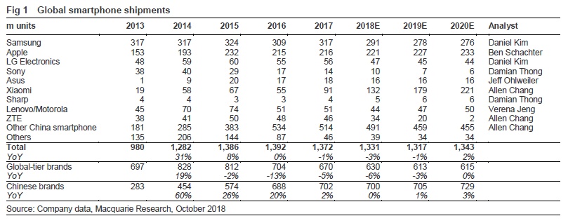 首先,中外机构的观点基本一致,全球智能手机出货量肯定是要降的,麦格理预计2019年降幅为1%,其中海外龙头降3%,而国内龙头得益于市场出清和海外扩张,反而能增1%。