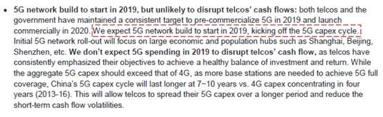 2)5G的商业化可能不会在2019年就立刻开启,要等2020年之后。