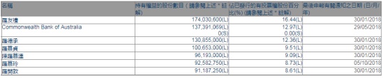 Commonwealth Bank of Australia:2017年10月12日以17.3152港元出售了652,000股,2018年5月2日以20.91港元买入了6,536,000股,2018年5月29日以24.15港元出售了130,000股;