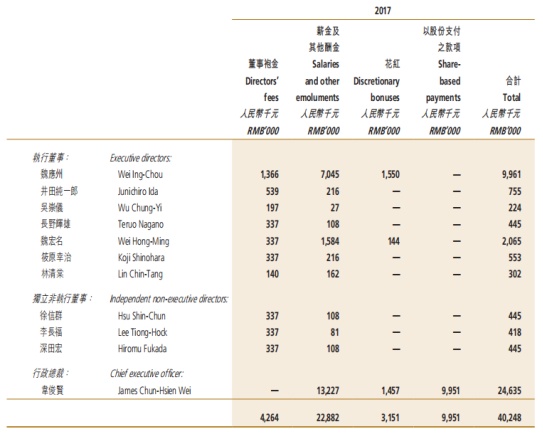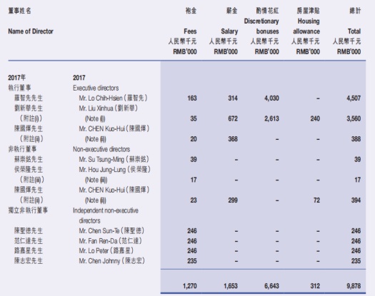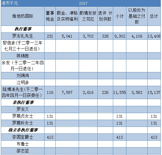 统一企业中国:罗智先450万人民币,刘新华356万人民币。从企业品牌规模来看维他奶国际给予管理层的薪酬偏高。