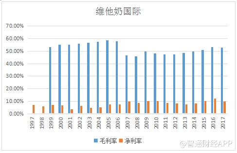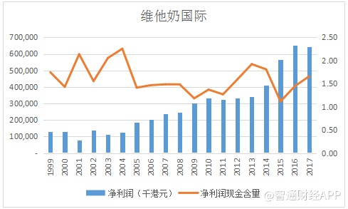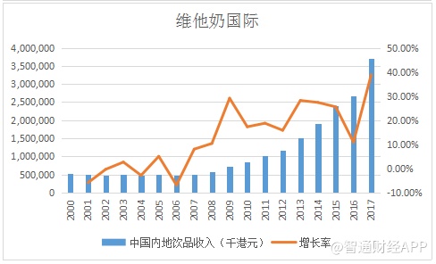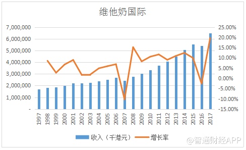 维他奶国际从1997年开始基本保持着8%左右的增长,2007年的下滑主要是因为将回扣及折扣从总销售收入扣除。维他奶基本保持着8%左右的增长,2016年的收入下滑是因为出售北美洲业务和山水品牌业务。