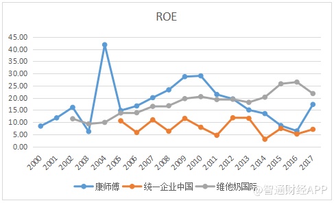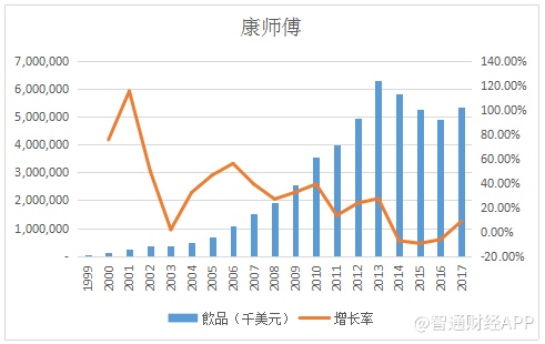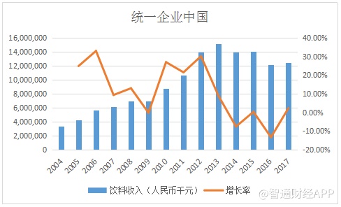 康师傅和他统一中国饮品收入都从2013年开始下滑,而维他奶国际大幅增长。康师傅和统一中国到2017年收入才开始出现恢复性上升,而维他奶国际持续两位数增长,到2017年更是增长35%左右。