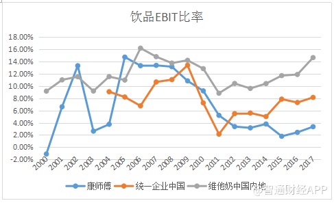 维他奶中国内地饮品EBIT比率2009年后开始高于统一企业中国和康师傅。