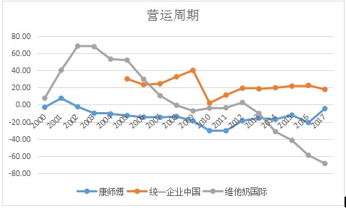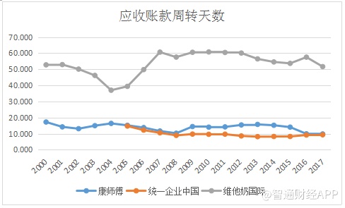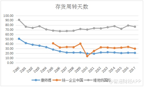 存货周转天数来看:维他奶国际在70天以上,而康师傅是从2000年开始逐步下降,到现在的20天。统一中国在30天左右。