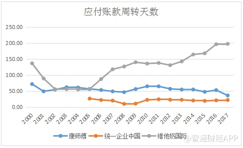 应付账款周转天数维他奶国际也高于康师傅和统一中国达到200天。