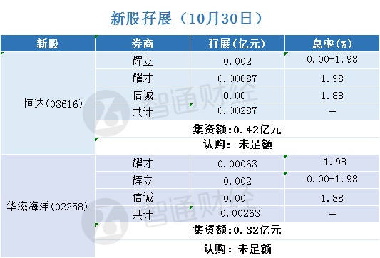 智通财经APP获悉,恒达(03616)、华滋海洋(02258)正在招股中。截至10月30日,辉立、信诚、耀才三家券商,为恒达(03616)、华滋海洋(02258)分别借出0.42亿及0.32亿孖展金,认购未足额。