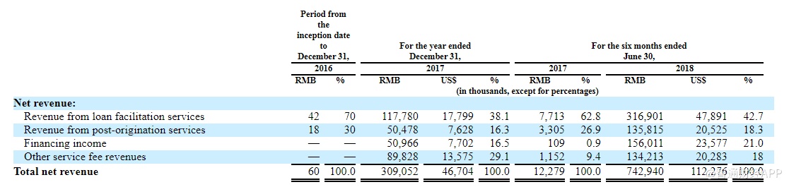 依托国内消费金融巨大的市场需求,360金融虽然诞生于互联网金融监管开始加强的时间点,但其收入依然取得迅猛增长,2016年净收益仅为6万元人民币,2017年激增至3.09亿元,截止2018年6月30日的六个月,公司的净营收达到7.429亿元,超过去年全年的两倍多。今年上半年,该公司撮合贷款服务费和贷后服务费、融资收入和转介服务收入分别为4.527亿元人民币(单位下同)、1.56亿元9320万元。