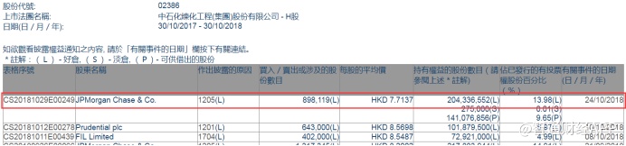 智通财经APP获悉,根据联交所资料显示,摩根大通于10月24日减持中石化炼化工程(02386)89万股,每股作价7.71港元,总值686.19万港元,最新持股量减至13.98%。