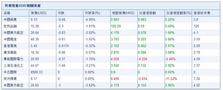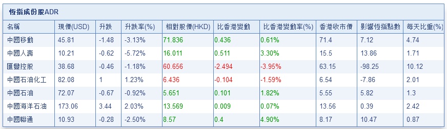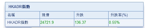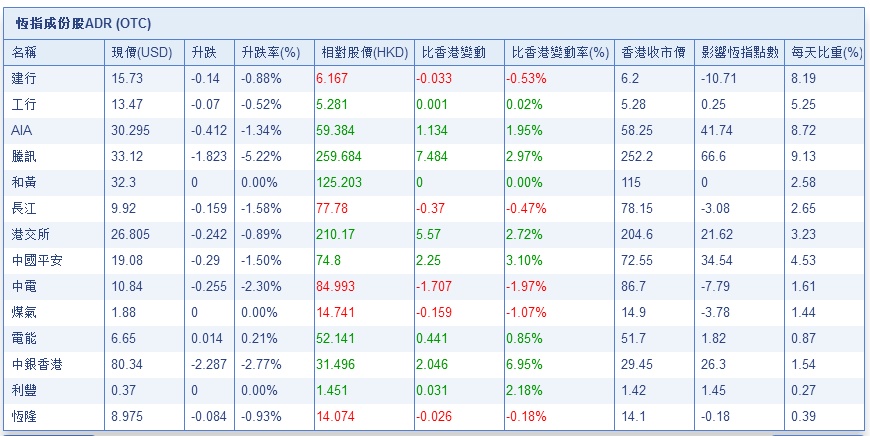 隔夜美股大涨,港股ADR指数走势向好,按比例计算,收报24721.9点,升136.37点或0.55%。大型蓝筹上涨居多,汇丰控股收报60.65元,较港收市跌2.49元;腾讯控股收报259.68 元,较港收市升7.48元。