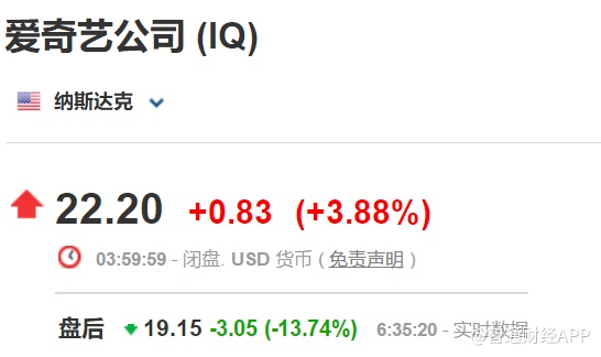 财报公布后爱奇艺股价盘后暴跌13.74%,报19.15美元。