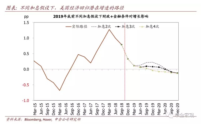 这一背景下,美国经济何时回落至潜在增速?我们结合财政刺激影响消逝的预计路径,重点分析当前至2019年底美联储不同加息情形下美国经济增速回落的可能路径: