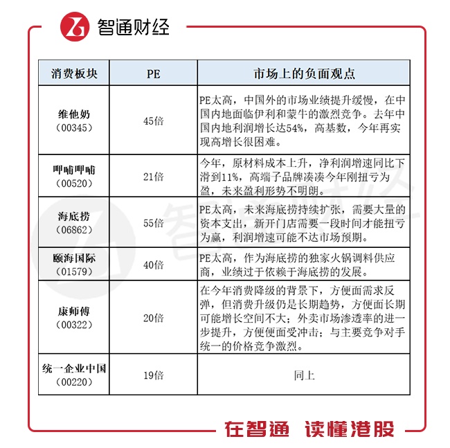 因此,熊市杀估值是不需要理由的。也许企业唯一的“错”在于它的高估值或低成长。截止到10月29日收盘,被称为“印钞机”的贵州茅台的动态市盈率已经跌到20倍以下。那么港股的消费板块有哪些企业估值目前高于茅台呢?下表展示了部分估值较高的标的。