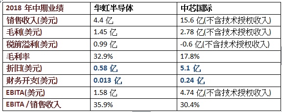 基于上述的财务状况,加上产能满载,以及专注于嵌入式非易失性存储器、分立器件、仿真与电源管理、逻辑及射频技术等特色工艺的策略奏效,华虹交出了亮丽的2018年中期业绩。销售收入增长15.4%至4.4亿美元,毛利率增加1.4%至32.9%的高水平,致令净利增加25.5%至0.86亿美元。管理层在业绩会更豪情壮语地说:"不管是股价是产品模式,我们和中芯逐渐在拉开差距。"