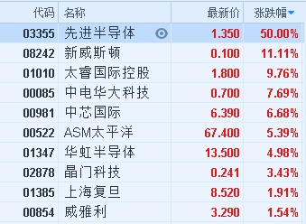 智通财经APP获悉,三季度全球半导体销售额年增逾13%,创历史新高,半导体板块全线反弹。截至14时37分,先进半导体(03355)涨50%,报1.35港元,中芯国际(00981)涨6.68%,报价6.39港元,ASM太平洋(00522)涨5.39%,报67.4港元,华虹半导体(01347)涨4.98%,报13.5港元。