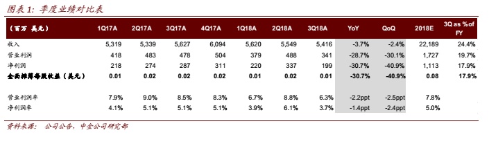万洲国际(00288)公布3Q18业绩:营业收入54.16亿美元,同比降3.7%;单季盈利1.99亿美元,同比下滑30.7%,因营业利润同比下滑28.7%所致。中美欧三地单季营业利润同比表现均逊于上半年,系不同原因三季度业绩不及预期。但趋势将持续向好,期待欧洲收购新产能年底前获批,美国养殖与屠宰业务利润四季度将有环比改善,中国业务盈利受猪瘟病影响轻微,且四季度又将迎来低可比基数。