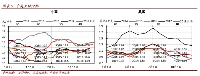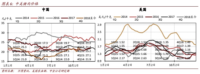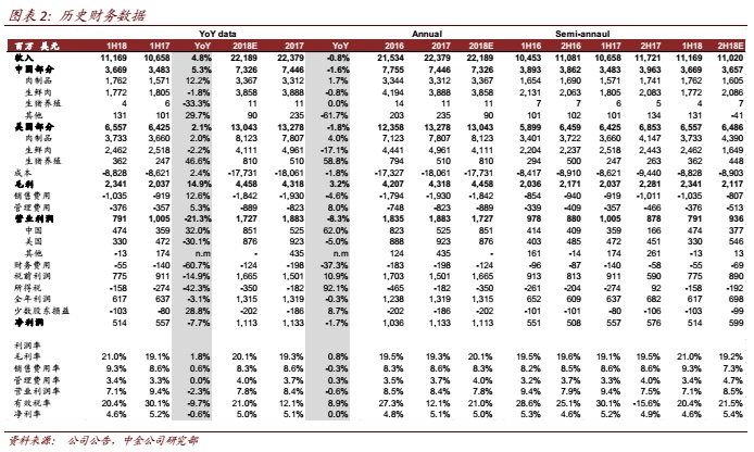 因此我们预计 4Q18美国业务营业利润同比跌幅有望大幅缩减至1H18水平,所得税率同比降低甚至会使4Q18美国业务净利润接近同比持平。展望19年,公司预期美国猪价和肉价均有小幅回升可能,今年以来公司致力于精进美国9 间屠宰场的效率以降低成本,且美国国内运力紧张导致运输成本上升趋势也将在19年改善,因此18年屠宰业务低盈利基数将导致19年屠宰业务盈利出现恢复性增长,同时猪价改善预期也会带来养殖业务盈利好转。此外,猪价和肉价轻微回升预期并不会带来下游肉制品业务盈利压力,因公司持续致力于产品结构改善的努力将会继续。